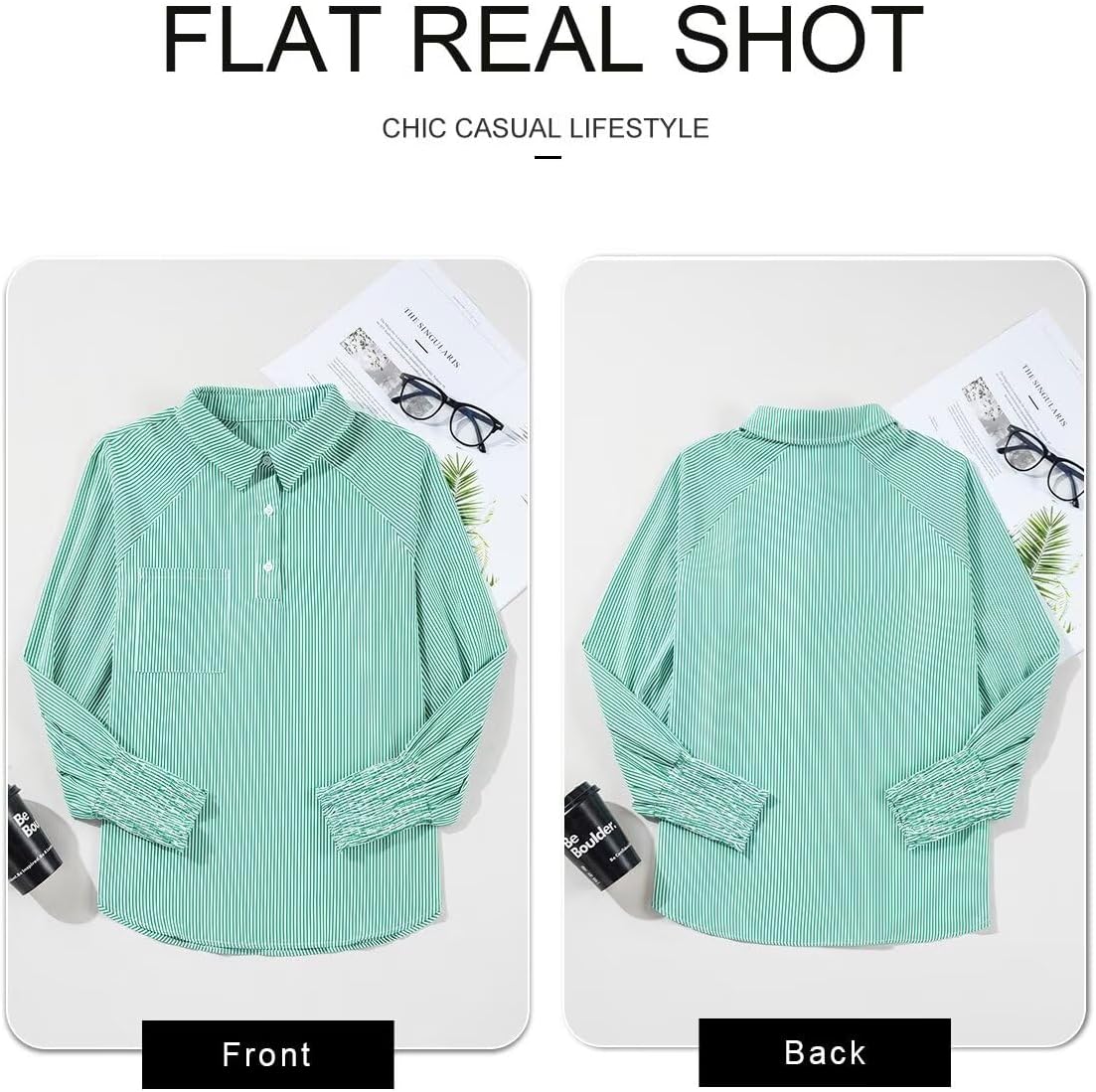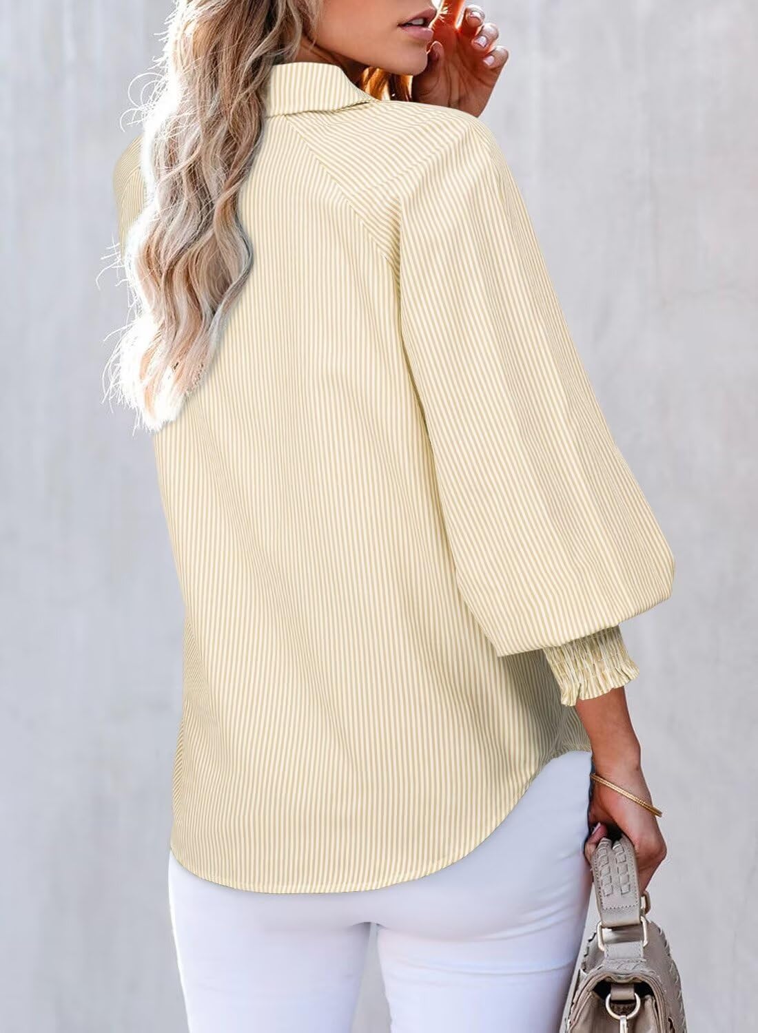 Women 2025 Fine Striped Smocked Cuffed Henley Shirts Long Sleeve Collared Blouse Tops with Pocket
